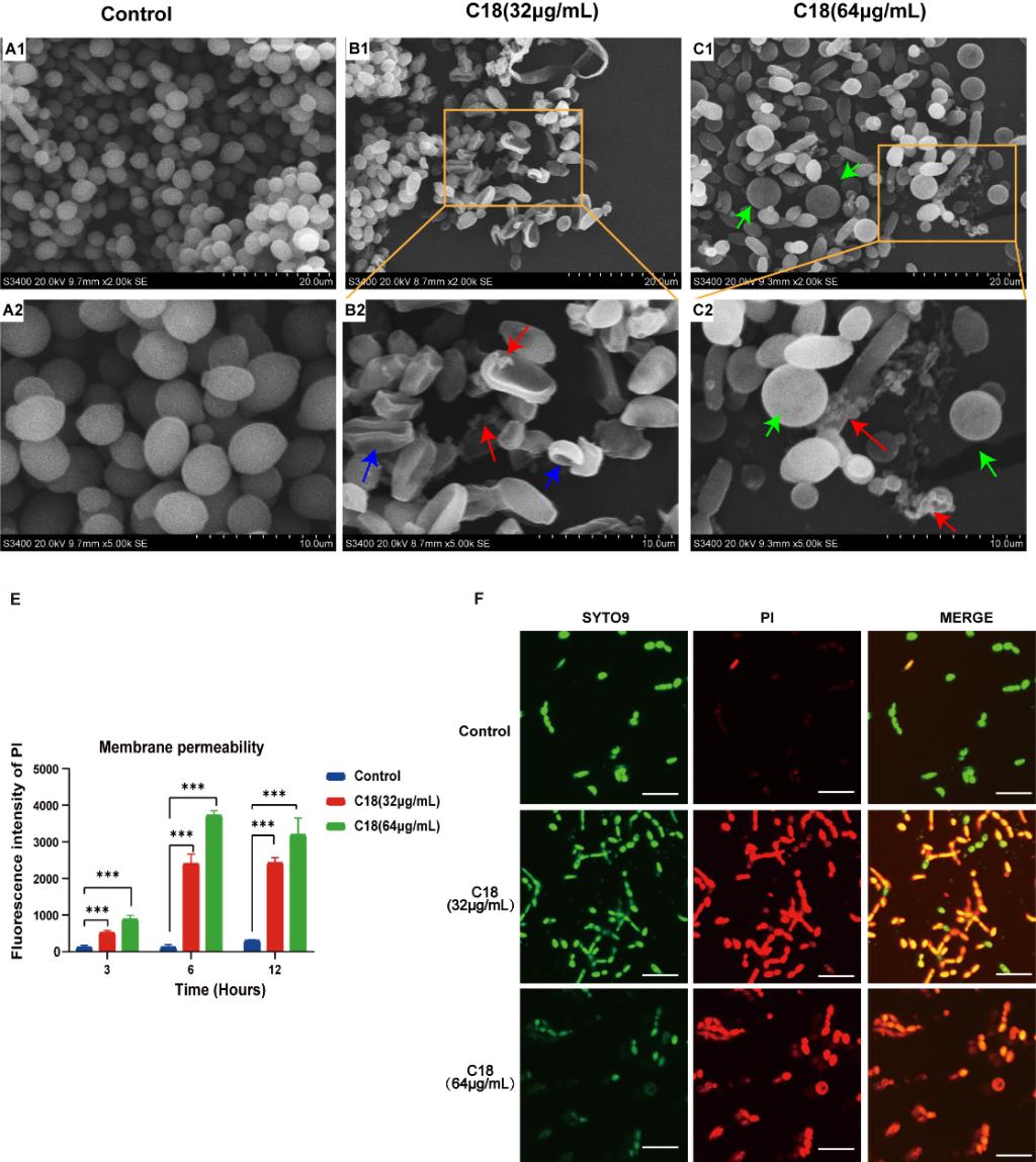 C18处理白念珠菌后,菌细胞细胞壁疏松分散,表面出现粗糙或不规则,还出现内容物渗漏(红色箭头)、表面折叠或凹陷(蓝色箭头)、不同大小和细胞肿胀(绿色箭头)。在C18存在下观察到白念珠菌细胞壁的破坏,需要对膜损伤进行更密切的研究。利用PI摄取来研究C18对真菌细胞膜完整性的影响,发现C18以剂量依赖的方式促进白念珠菌细胞的膜通透性增加,活细胞数量减少。
