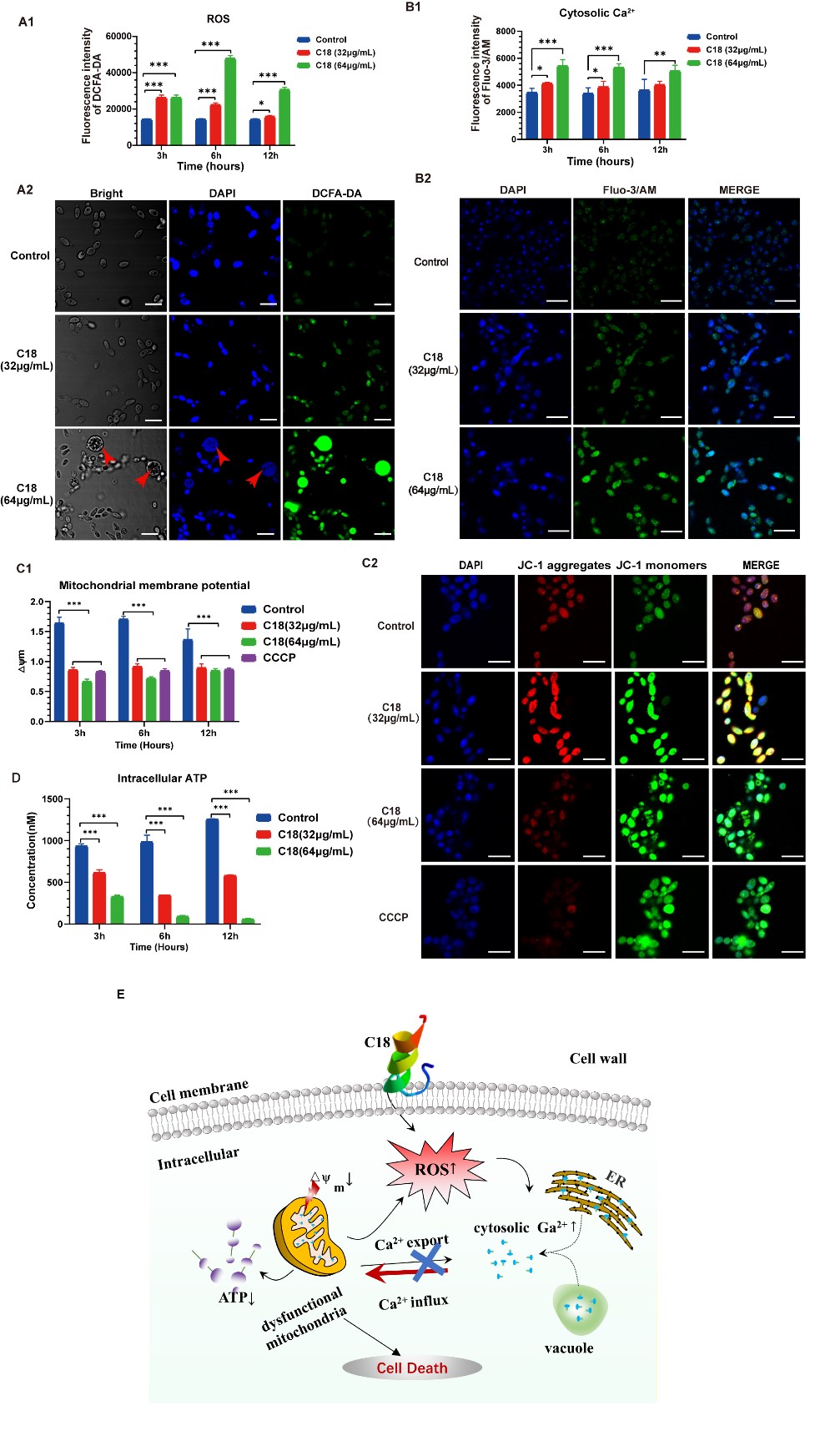 C18处理后,白念珠菌细胞的ROS水平以剂量依赖的方式增加,6h后 ROS水平达到最高,胞质Ca2+水平和荧光强度增高,线粒体膜电位(ψm)降低,APT耗竭。表明C18干预造成胞质内ROS蓄积和Ca2+转运失衡,当线粒体被ROS损伤,引起氧化应激,诱导细胞凋亡或死亡,细胞中产生更多的ROS;另一方面,线粒体也是一个动态的Ca2+存储库,调节线粒体和细胞质之间的Ca2+平衡。ψm极化和ATP消耗表明C18促进细胞内ROS生成和Ca2+蓄积,进而诱发线粒体功能障碍。
