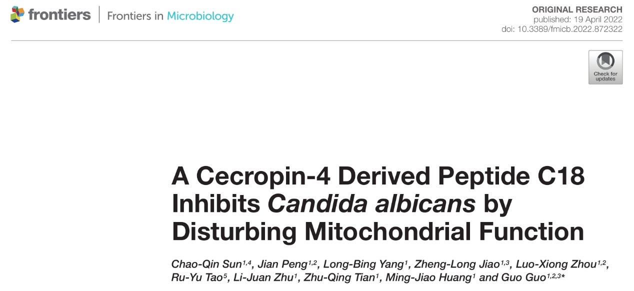 2022年3月14日,mk官网首页病原生物学实验室国果教授团队在Frontiers in Microbiology(IF=5.640;JCR Q1;中科院二区)杂志上发表了题为A Cecropin-4 Derived Peptide C18 Inhibits Candida albicans by Disturbing Mitochondrial Function的研究论文。该研究发现,对源于家蝇的天蚕素4衍生肽C18对念珠菌表现出良好体外抗真菌活性,尤其对经典抗真菌药物氟康唑耐药的念珠菌有效。表型上观察到C18延缓白念珠菌的生长周期,损坏菌体结构,降低其毒力,其抗真菌机制涉及膜通透性改变和线粒体功能。这项工作不仅有助于理解抗菌肽发挥抗真菌作用的作用机制,而且为临床抗真菌治疗增加了新的选择可能。