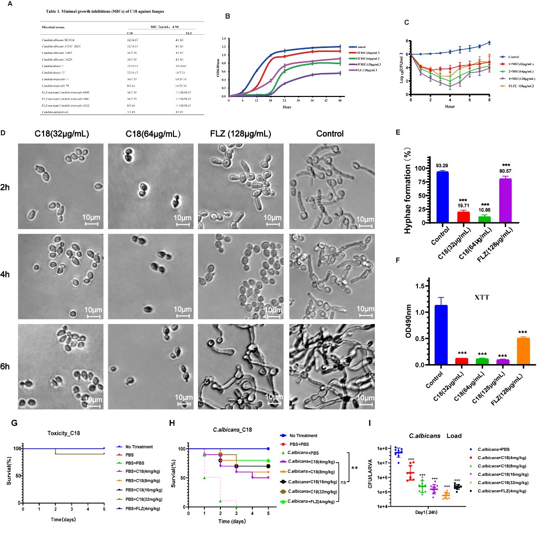 本研究发现C18对白念珠菌的最低抑菌浓度(MIC)为4~32μg/mL,对临床耐氟康唑的白念珠菌的MIC为8~16μg/mL。1~4 MIC的C18以浓度依赖方式延缓念珠菌进入对数生长期,在前4h可杀灭99%以上的白念珠菌。而且能抑制白念珠菌菌丝转换,降低酵母细胞发芽率,抑制生物膜的形成;提升念珠菌感染大蜡螟幼虫的存活率,降低幼虫体内的白念珠菌载菌量。总之,C18表现出明显的抗真菌活性和降低白念珠菌毒力的效应。