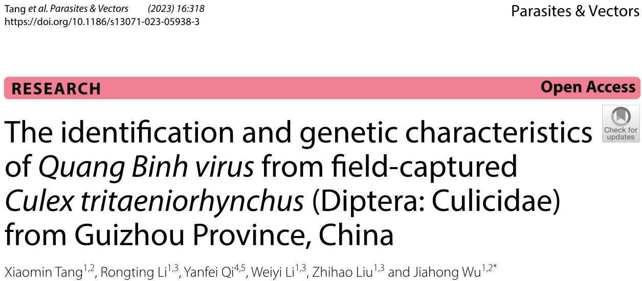 mk官网首页病原生物学实验室吴家红教授团队在Parasites & Vectors(IF=3.2;JCR Q1;中科院二区)杂志上发表了题为The identification and genetic characteristics of Quang Binh virus from field-captured Culex tritaeniorhynchus (Diptera: Culicidae) from Guizhou Province, China的研究论文。