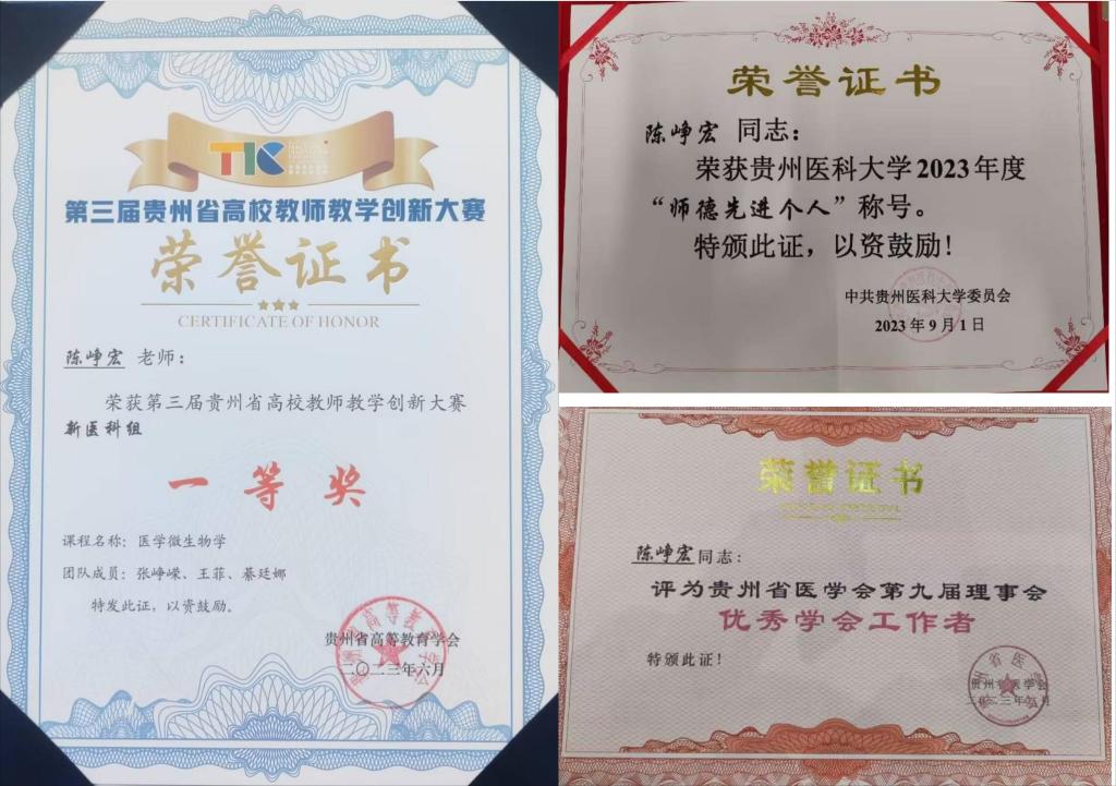 贵州省普通高等公司病原生物学特色重点实验室主任陈峥宏教授团队在第三届贵州省高校教师教学创新大赛新医科组中荣获一等奖。该团队由陈峥宏教授带领,成员包括张峥嵘、王菲和綦廷娜。此外,陈峥宏教授还荣获mk体育官方平台2023年度“师德先进个人”称号,并被评为贵州省医学会第九届理事会优秀学会工作者。