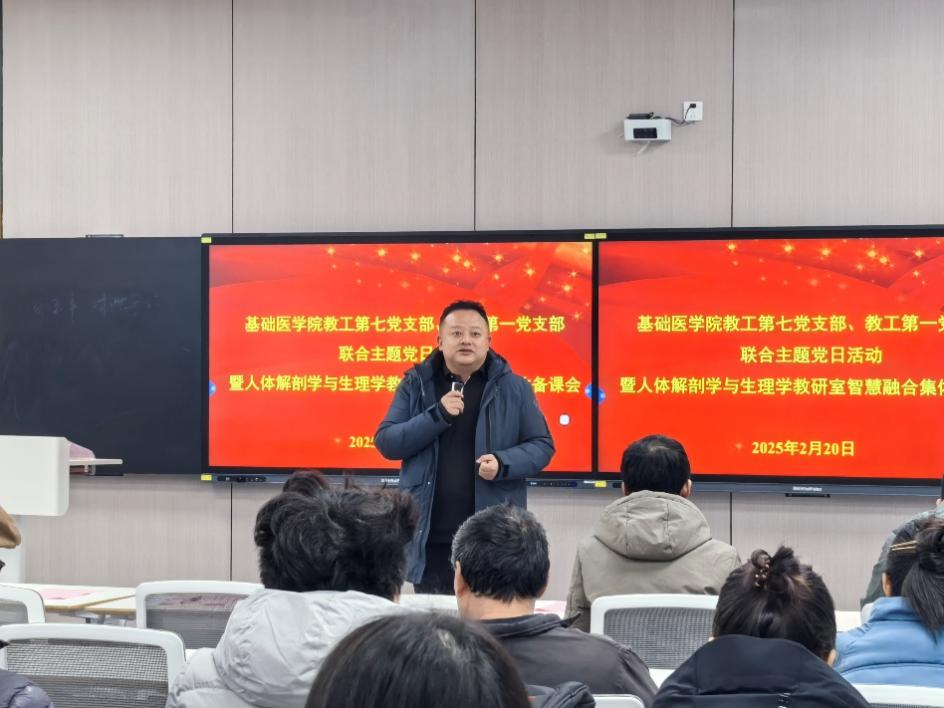 2 月 20 日,mk体育教工第七党支部、第一党支部在公司 L104S 智慧教室联合举办主题党日活动暨人体解剖学与生理学教研室智慧融合集体备课会议。此次活动旨在通过集体研讨,促进教师深入钻研教材,将解剖知识与生理学原理融合,提升教学效果和专业素养。集团教学质量监控与评估办公室主任兼教务处副处长修江帆、公司副经理余资江及教研室全体教师参会。活动由人体解剖学教研室主任孙宝飞主持。