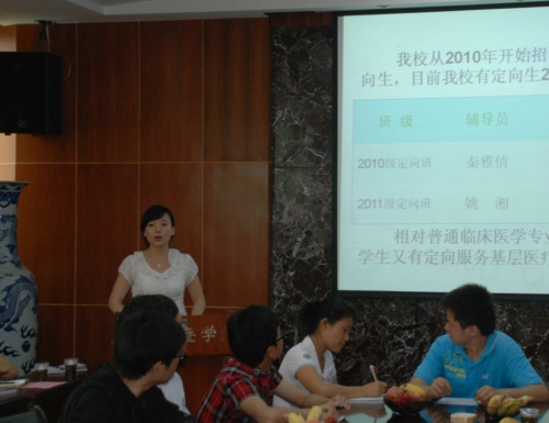 首先辅导员秦雅倩老师汇报了2010级、2011级定向班的基本情况和进校后取得的成绩。教务处副处长温小军详细介绍了农村订单定向医员工免费培养工作相关政策,深入浅出地剖析了全科医生的内涵和发展前景,特别强调了服务基层的重要性。员工处处长周嫆言简意赅地说明要做好基层医疗的服务工作,必须提高员工的组织能力和人文素质。mk体育经理徐国强语重心长地对定向生提出两点期望,一要有扎实的临床知识,二要有沟通能力。交流中,师生们畅所欲言,各抒己见,发自肺腑,科任老师们对定向班员工刻苦的学习态度及良好的课堂纪律给予了高度的赞扬和肯定,也纷纷为员工解答了学习、生活、就业等方面的疑问。mk体育官方网站入口党委书记张红霞做总结,她强调定向班同学要从思想上树立为基层人民健康服务的理念,要珍惜学习机会,努力学习,不负人民的重托。