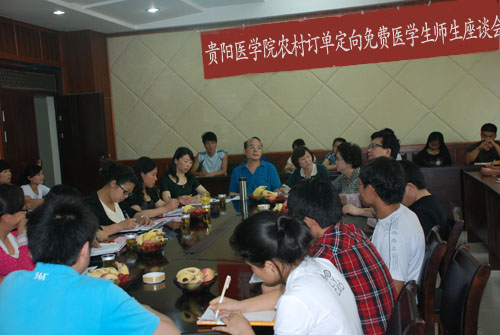 为进一步做好农村订单定向医员工免费培养工作,稳定定向班同学们的专业思想,进一步树立服务基层的远大理想,培养“下得去、用得上、留得住”的高级卫生人才,mk体育于2012年5月7日下午在基础二号楼三楼会议室召开mk体育定向班师生座谈会,贵阳医公司员工处处长周嫆,教务处副处长温小军、分子生物学重点实验室常务副主任单可人,医学定向班各科科任教师,mk体育官方网站入口党委书记张红霞、经理徐国强、党委副书记周红及2010级、2011级定向科任课教师、辅导员和员工代表46人出席了座谈会。座谈会由mk体育官方网站入口党委书记张红霞主持。