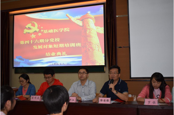 6月29日,mk体育分党校在厚德楼101教室隆重举行第四十六期入党积极分子培训班暨第二批发展对象短期培训班结业典礼。mk体育官方网站入口党委书记徐国强、党委副书记廖兴江、临床医学2015级党支部书记洪潇潇、临床医学2016级党支部书记罗恒及辅导员刘慧、商传禹参加结业典礼,典礼由陈培各主持。