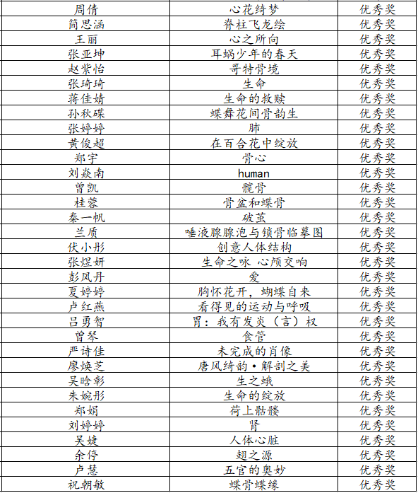 mk体育第六届人体解剖学与组织胚胎学手绘大赛已经落下帷幕,本次大赛充分调动基础学子参与医学绘图的积极性,以生动的画笔描绘医学知识的深刻,激发员工探索医学和艺术之间的学科融合。在前期提交的166份作品中,经过教研室专业教师从科学性、艺术性和创新性三个维度综合评分后,共60份作品进入决赛,经过激烈的角逐,最终评选出特等奖2名、一等奖4名、二等奖8名、三等奖12名、优秀奖若干。
