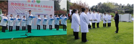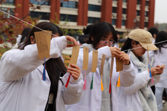 “健康所系,性命相托!”在李宗恩经理雕像前,200余名医员工身着白大褂,高举右拳庄严宣誓。铿锵誓言回荡上空,传递着新一代医者的坚定信念,展现医员工传承大爱、精研医术的决心。活动尾声,同学们将手写的感恩卡挂在mk体育杏林园。