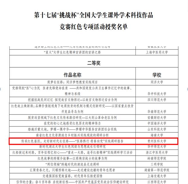 5月14日至17日第十七届“挑战杯”全国老员工课外学术科技作品竞赛红色专项活动终审决赛在四川大学望江校区落下帷幕。公司团队参赛作品《传承红色基因,走好新时代长征路—“医路黔行,青春向党”实践调研报告》荣获全国二等奖!