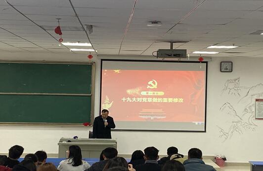 刘杰麟向同学们讲解了十九大对党章的重要修改,带领同学们一起深入学习贯彻党的十九大精神和习近平新时代中国特色社会主义思想,深刻学习领会党的建设的新要求,推动全面从严治党向纵深发展。他谈到作为一名党员,要自觉学习党章,执行党章,贯彻党章,维护党章,把学习党章与自身实际相结合,用实际行动践行党章的要求。
