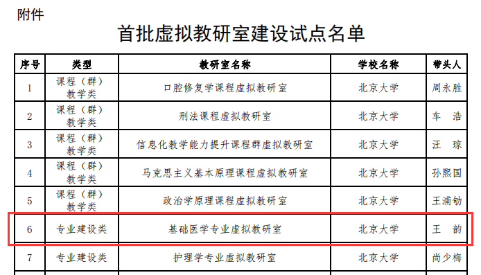 近日教育部发布《教育部办公厅关于公布首批虚拟教研室建设试点名单的通知》,mk体育参与申请的协和医公司王辰院土作为带头人的“生理课程虚拟教研室”、北京大学王韵教授作为带头人的“基础医学专业虚拟教研室”获批教育部首批虚拟教研室建设试点。