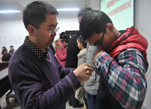 首先,党委副书记廖兴江对本次活动进行了介绍,他强调了党员佩戴党徽的重要意义,阐述了诚信对党员的重要性,最后希望员工党员能在期末考试中亮明身份,诚信应试,做好示范。全体老师为新党员佩戴了党徽,并由员工科老师带领员工党员重温入党誓词。最后党委书记徐国强为本次活动进行了总结。徐国强书记指出,入党是神圣而光荣的,是政治生命中最重要的事。希望员工党员对自己严格要求,充分发挥先锋模范作用,做好党建团建工作。