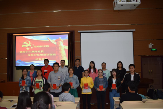 6月29日,mk体育分党校在厚德楼101教室隆重举行第四十六期入党积极分子培训班暨第二批发展对象短期培训班结业典礼。mk体育官方网站入口党委书记徐国强、党委副书记廖兴江、临床医学2015级党支部书记洪潇潇、临床医学2016级党支部书记罗恒及辅导员刘慧、商传禹参加结业典礼,典礼由陈培各主持。